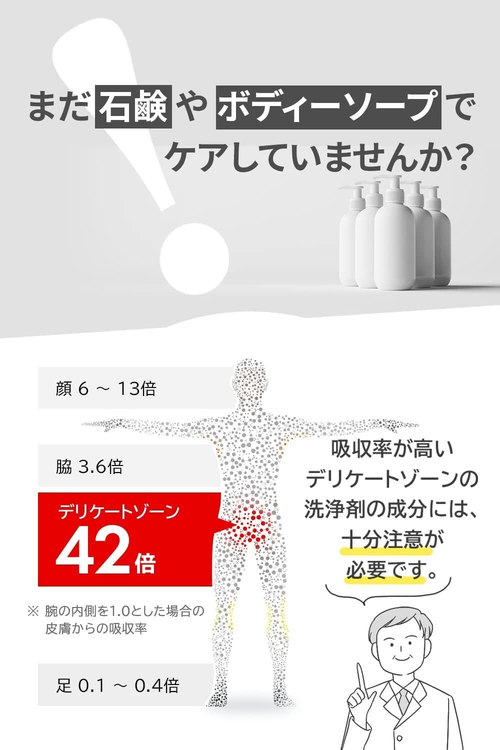 ・デリケートゾーンは腕の内側の42倍の吸収率。経皮毒に注意が必要な部位です。最適なpH5.5で、繊細なデリケートゾーンを優しくケアします。